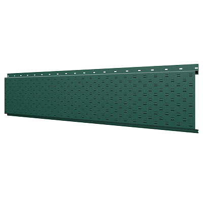 Линеарная потолочно-стеновая панель с ПЕРФОРАЦИЕЙ для вентиляции цвет RAL6005 Зеленый Мох Стальной Бархат применяется в качестве софитов для подшивы крыши, наружной и внутренней отделки потолков, стен, фронтонов фасада дома в Темиртау.