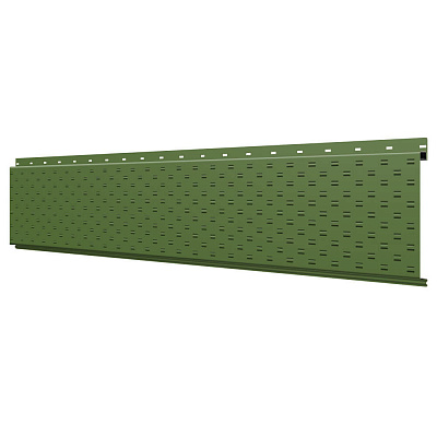 Линеарная потолочно-стеновая панель с ПЕРФОРАЦИЕЙ для вентиляции цвет RAL6002 Зеленый Лист применяется в качестве софитов для подшивы крыши, наружной и внутренней отделки потолков, стен, фронтонов фасада дома в Темиртау.